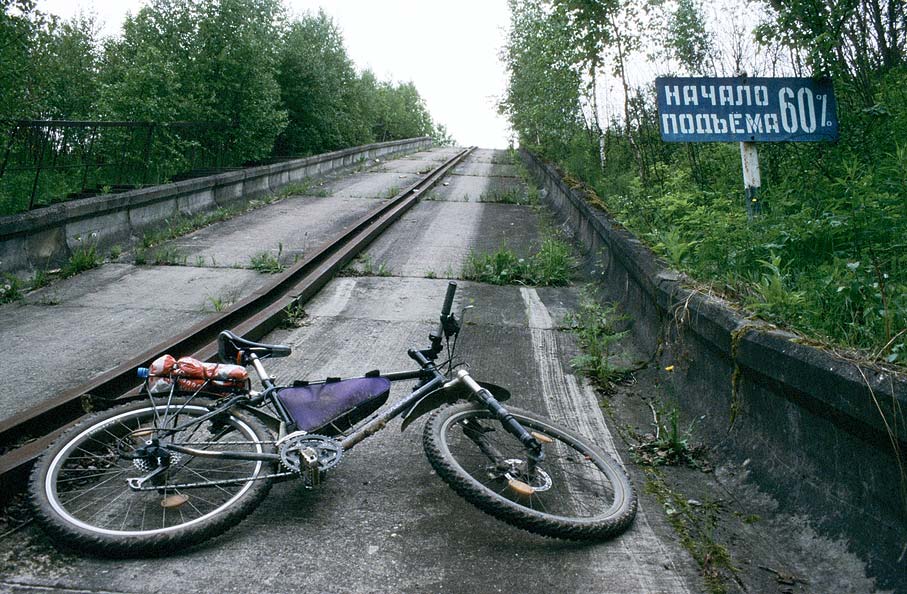 Начало подъема. Выше байк положить не удается -- сползает. Самому идти можно, но довольно стремно -- если поскользнешься, будешь ехать до самого низа.